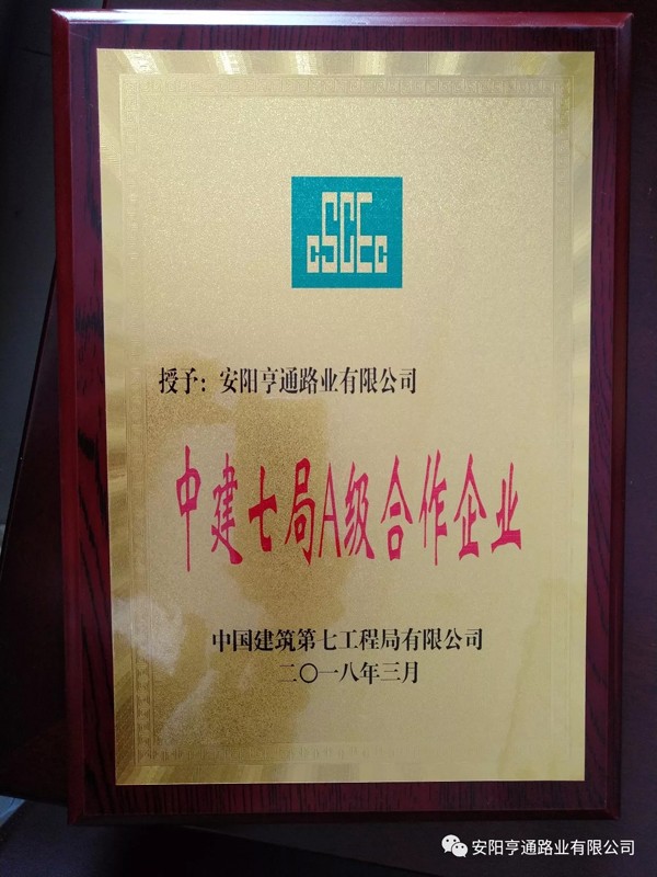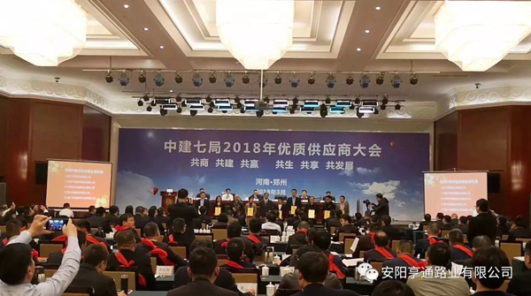 在2018年3月8日中建七局交通公司“2018年度生產(chǎn)推進會暨2017年度供應(yīng)商大會”上,安陽亨通路業(yè)有限公司又獲得了中建七局交通公司頒發(fā)的“優(yōu) 秀合作企業(yè)”的榮譽稱號。